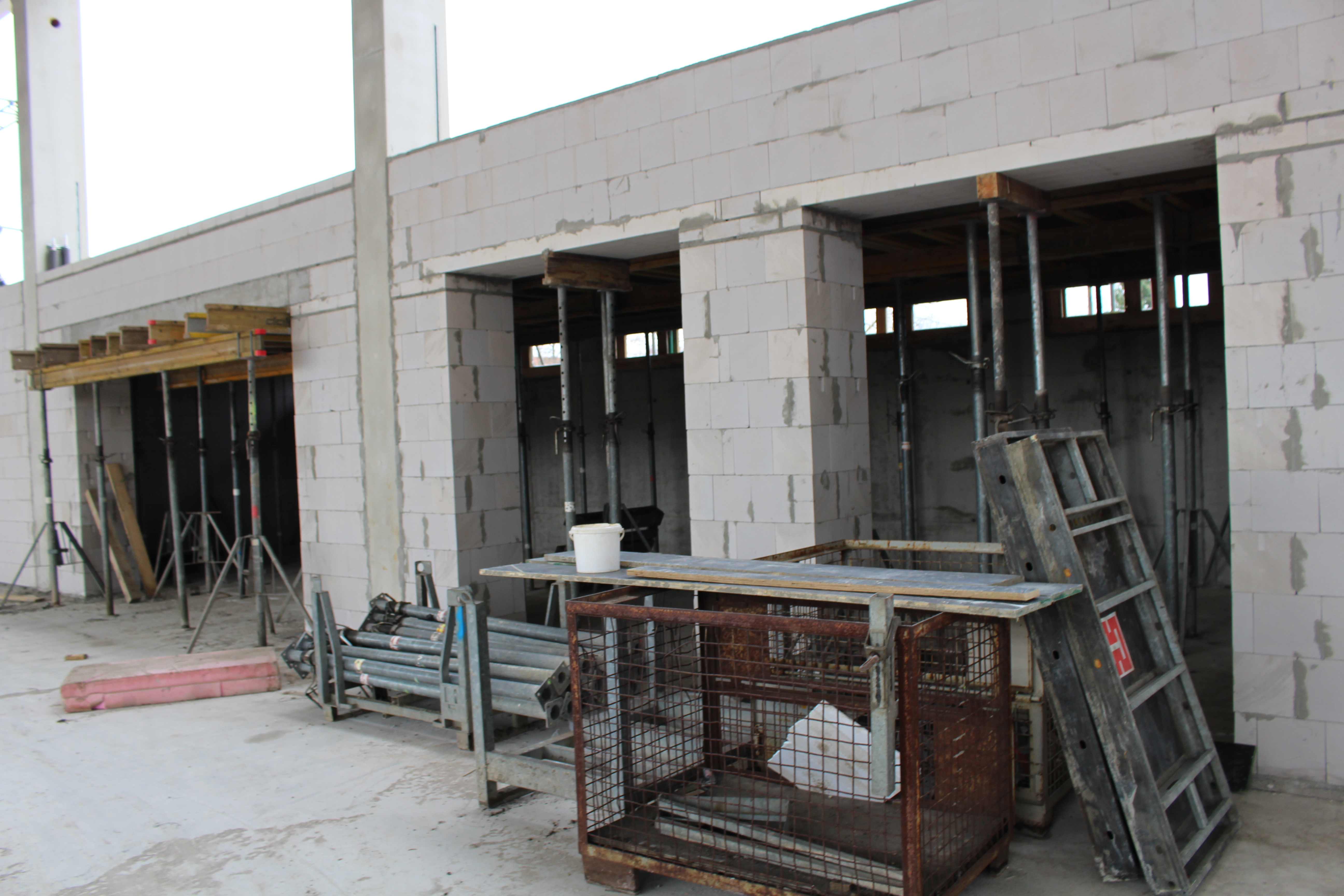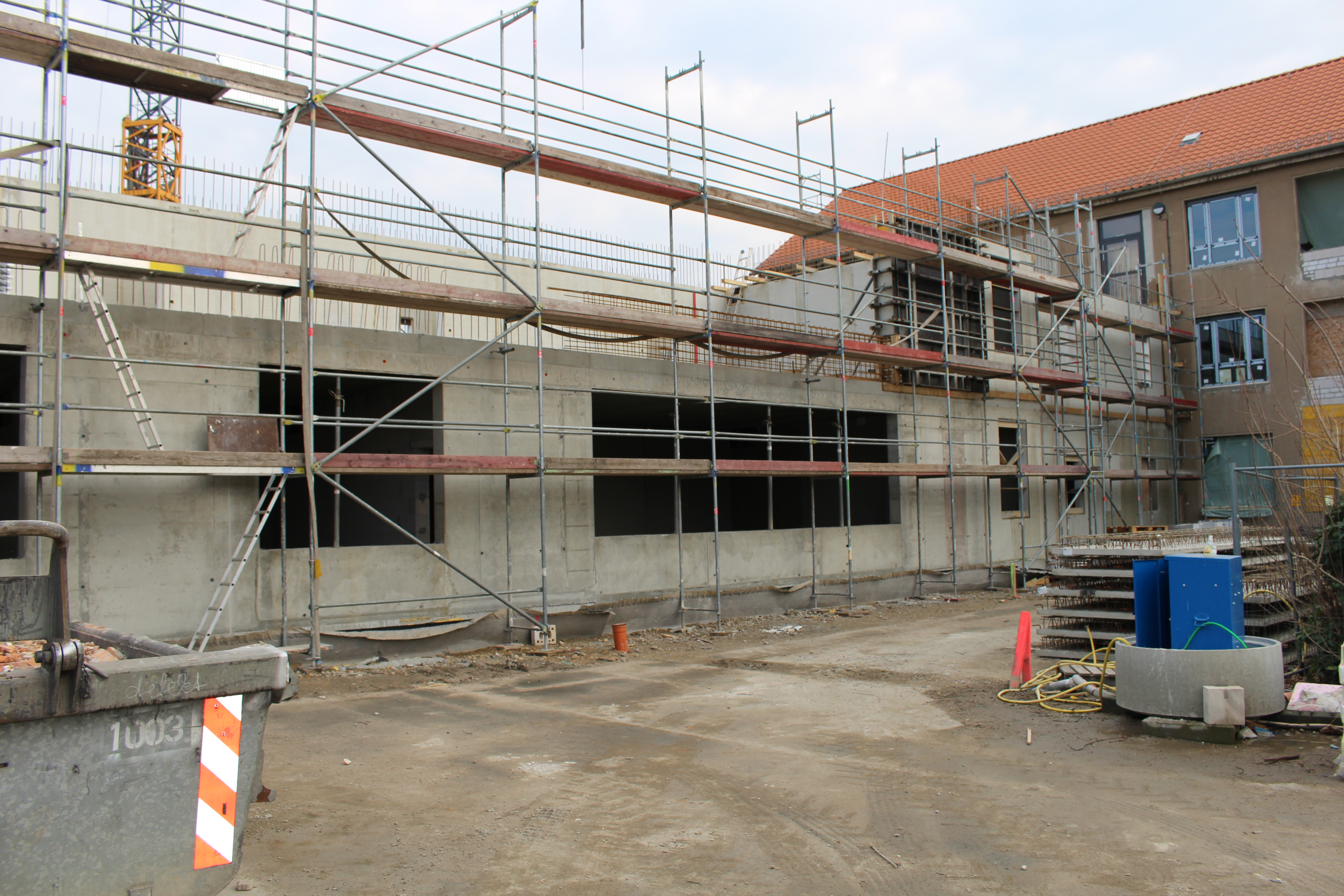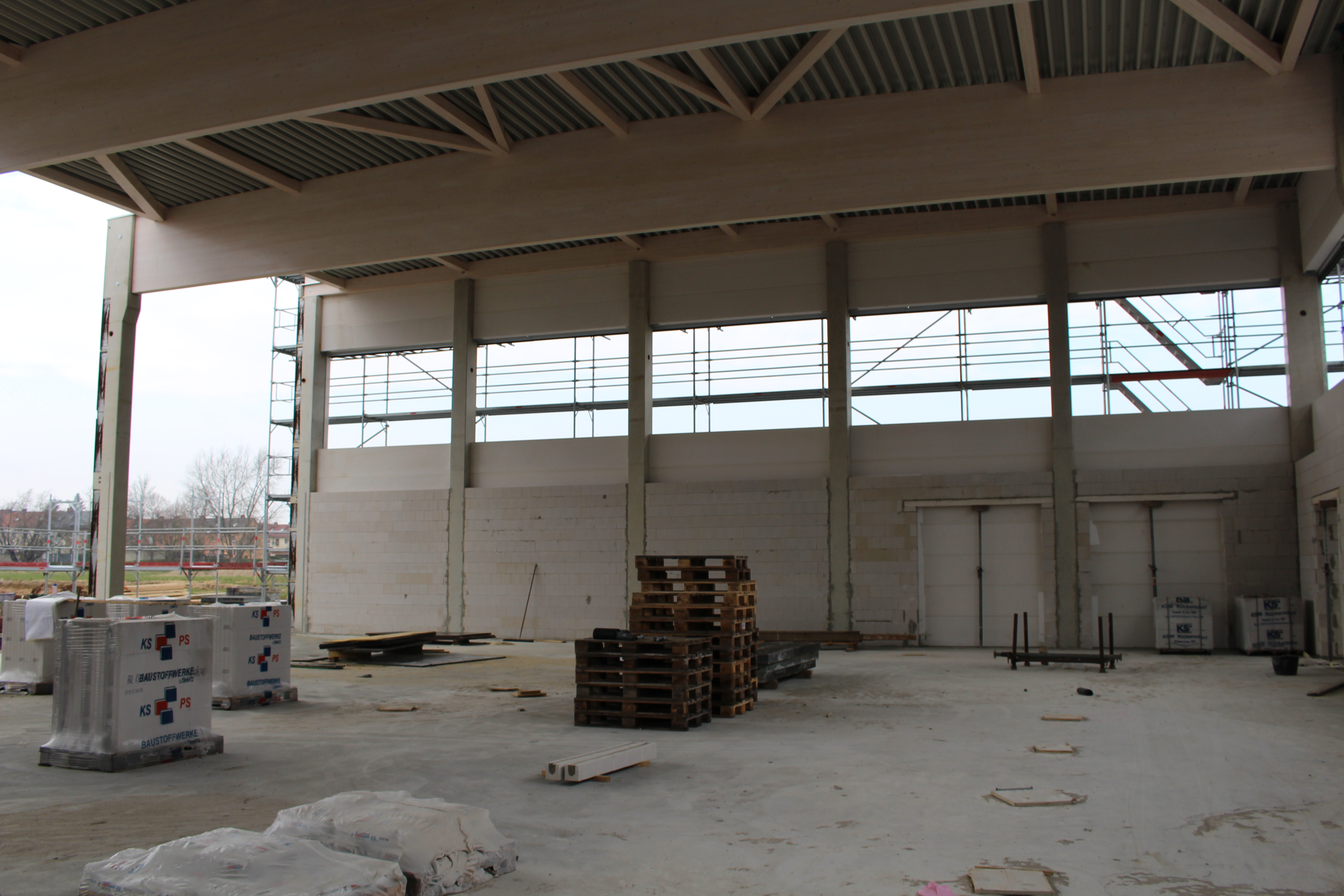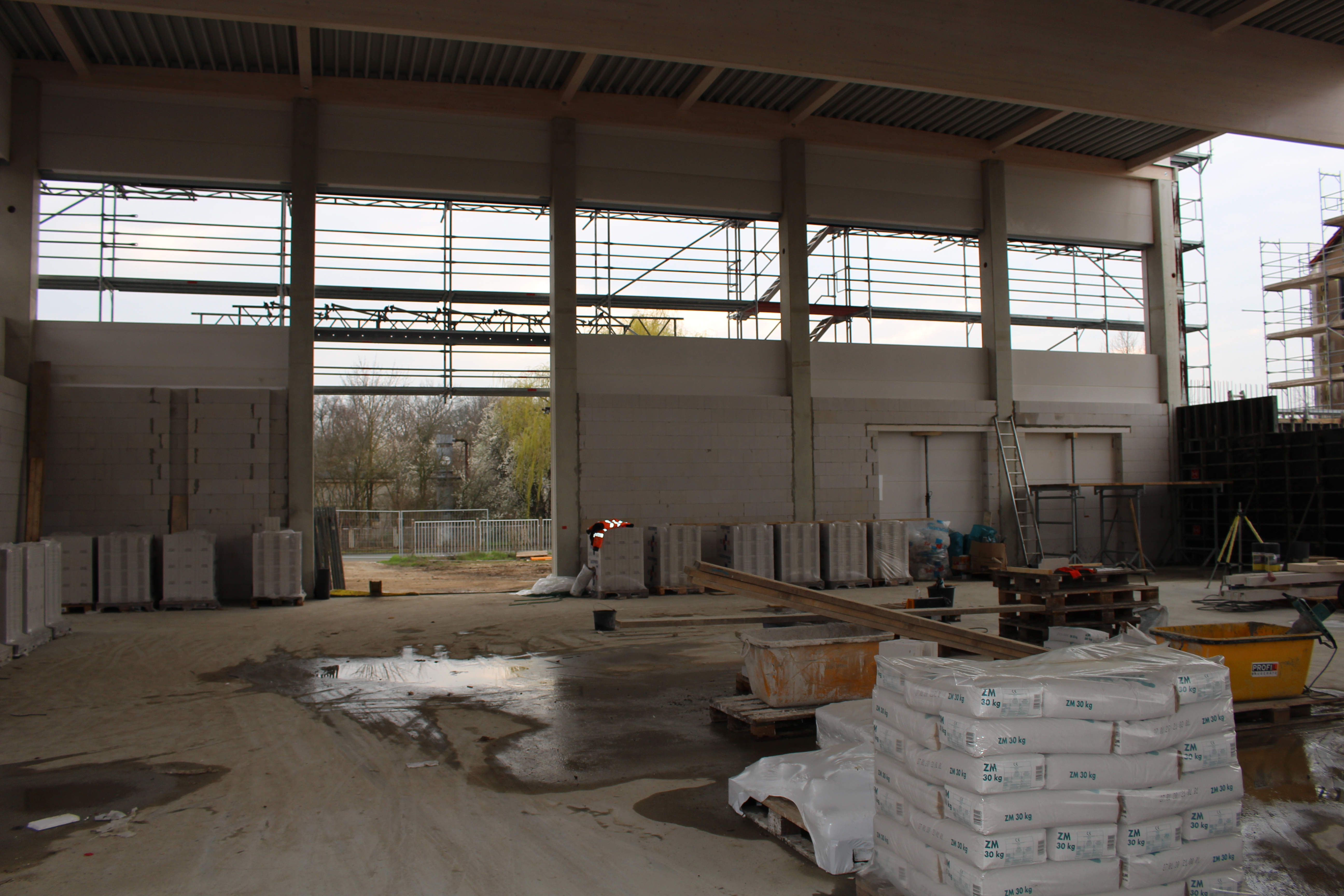 Die Turnhalle hat nun ein Dach bekommen. Auch das künftige Haus 3 wächst langsam in die Höhe.