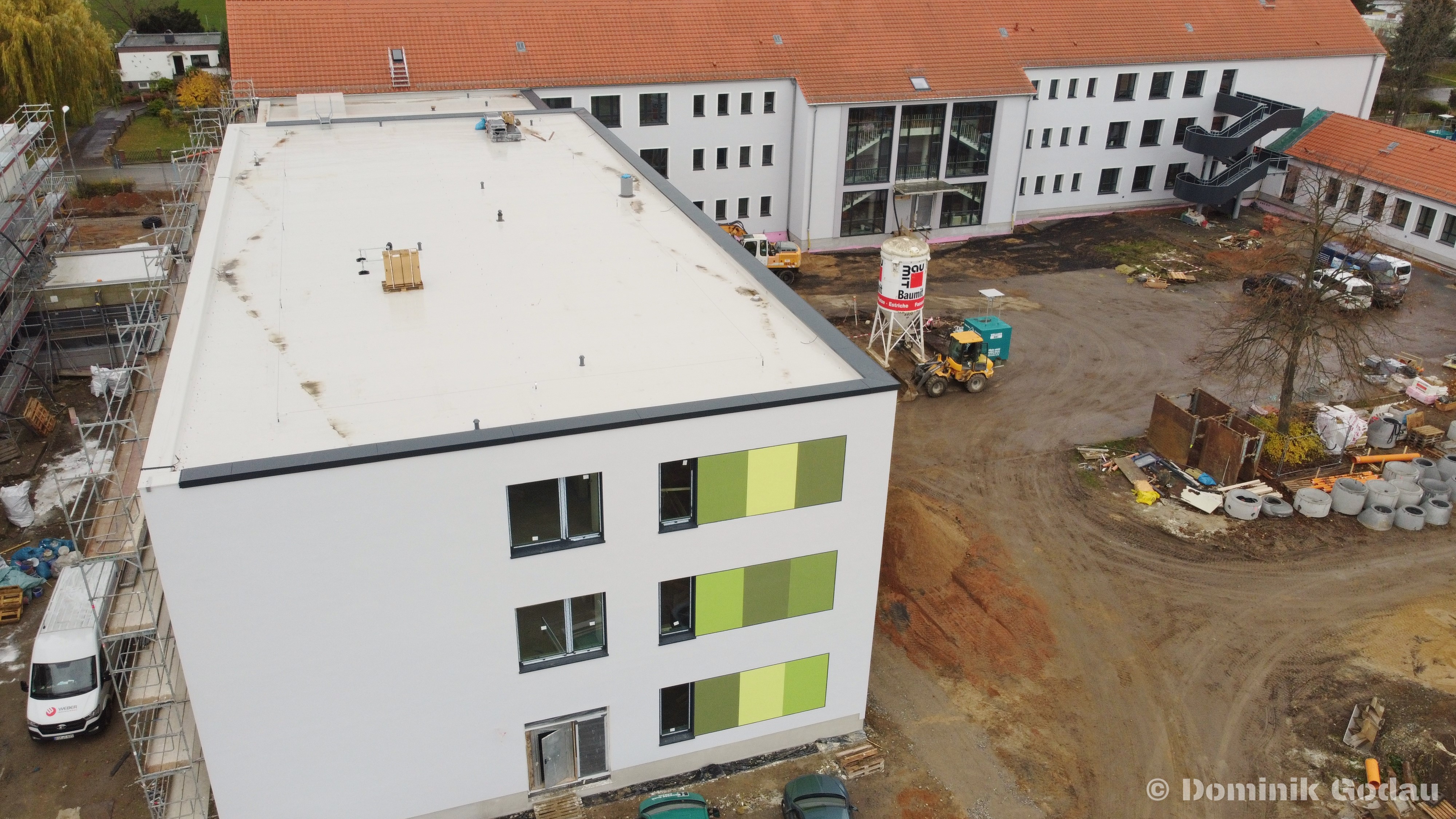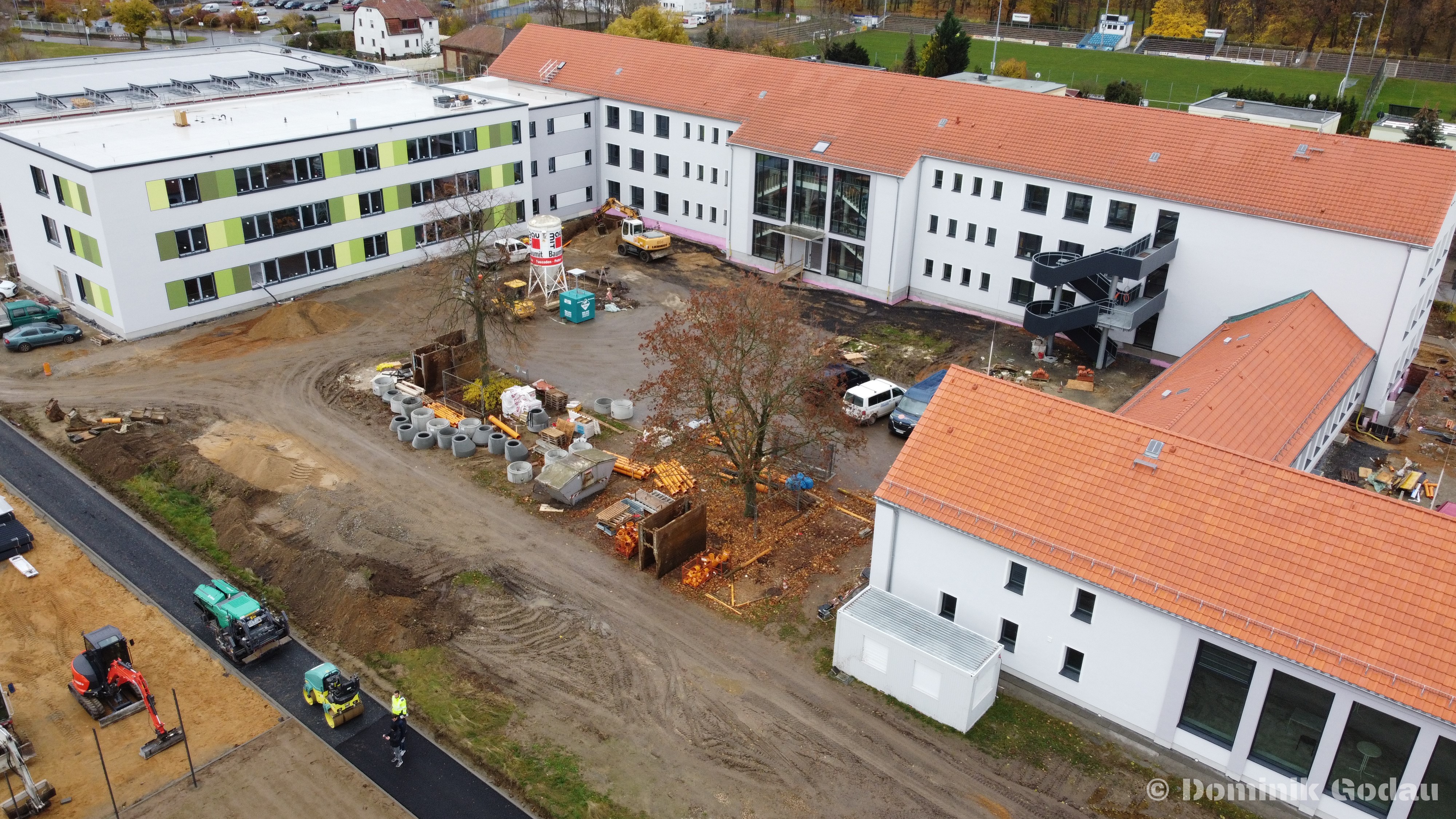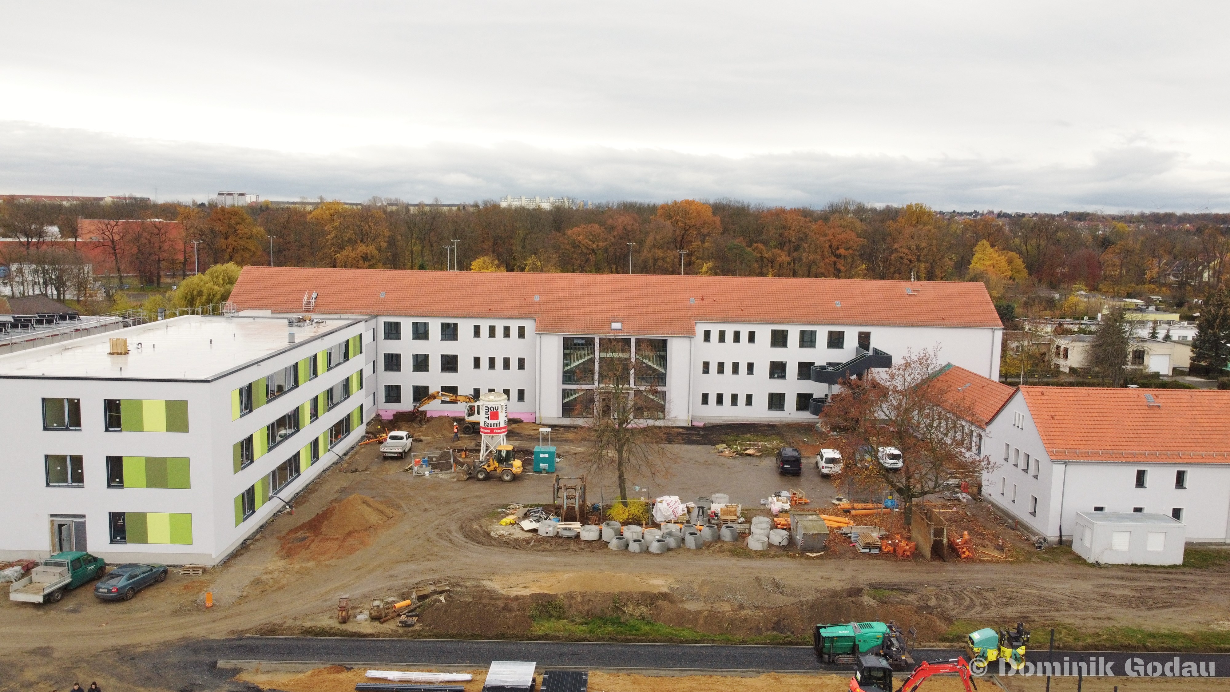 Heute haben wir für euch ein paar Bilder aus der Luft gemacht. Die neue Schule nimmt langsam Gestalt an. Auch die Außenanlagen sind langsam erkennbar. Außerdem wurde für die Öffentlichkeit ein kleiner Bürgerpark am Schulgelände errichtet.
